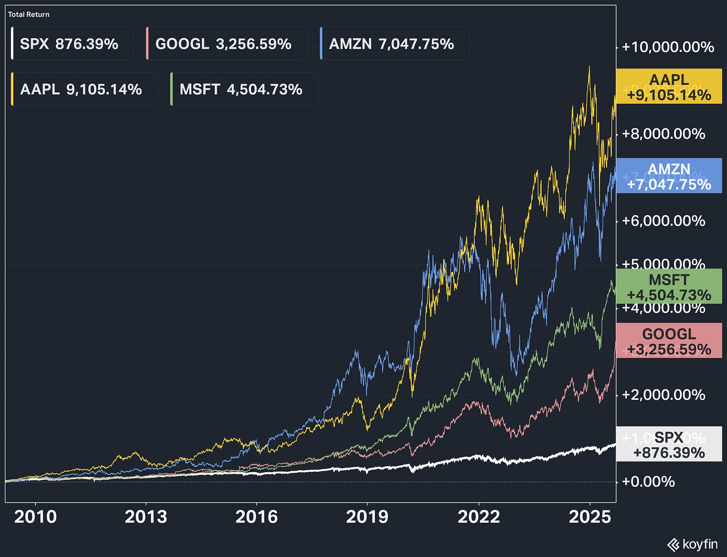There were other, greater winners – Nvidia is up 51.2 p.a since then, Netflix 38.9 p.a. – but they were harder to spot. Our lives were already being run on the other four.1